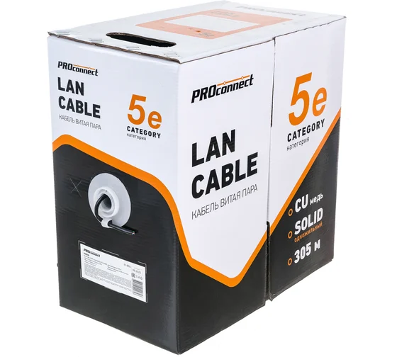 Кабель UTP 4PR 24AWG, CAT5e, наружный (OUTDOOR) (бухта 305 м) PROconnect. Неэкранированная витая пара, материал проводника высокоочищенная бескислородная медь, калибр (24 AWG). Материал оболочки — ПЭ (PE).